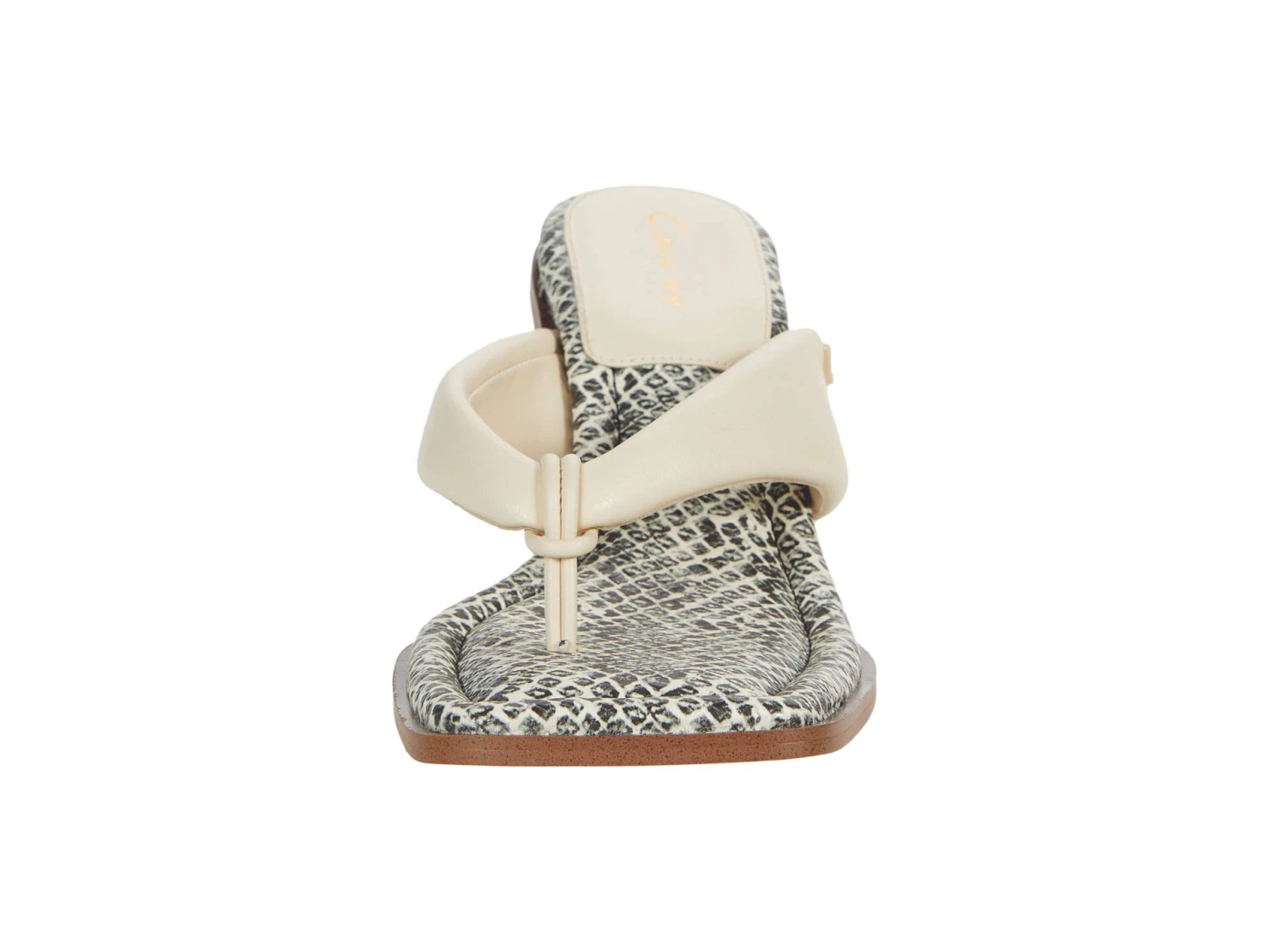 - Slip-on sandal features stylish synthetic upper with thong strap and faux-leather toe post.