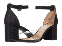 - Open-toe sandal with block heel and adjustable ankle strap.
