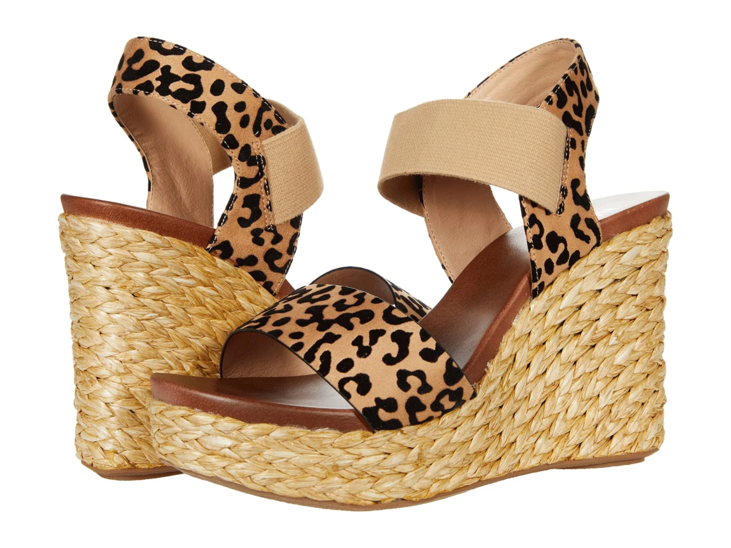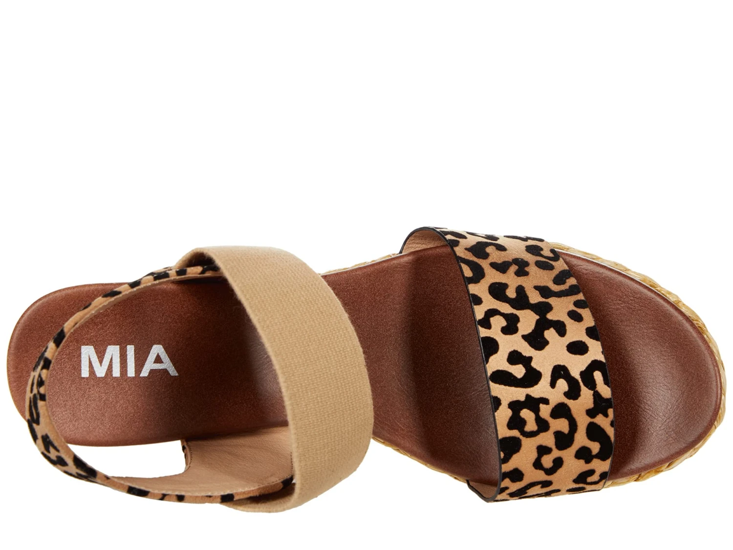 - Welcome the warmer weather in style wearing the MIA™ Villa-L featuring a woven wedged heel with padded footbed with buckle closures boasting all over cheetah print and elastic closures at ankles for a secure fit every time.