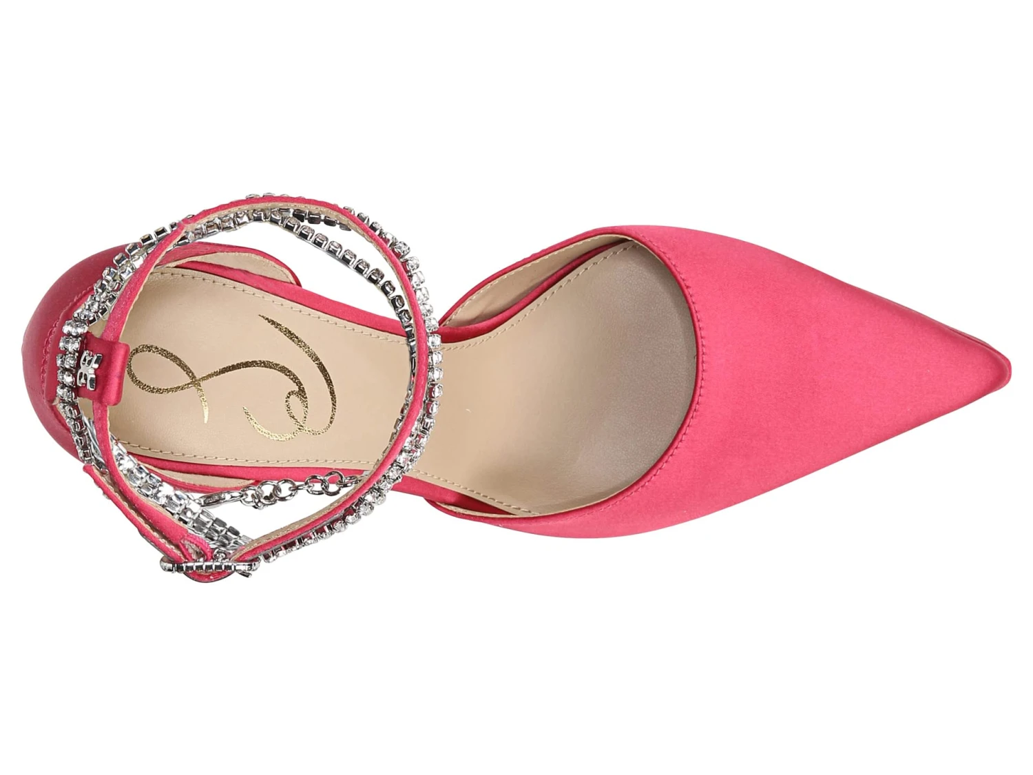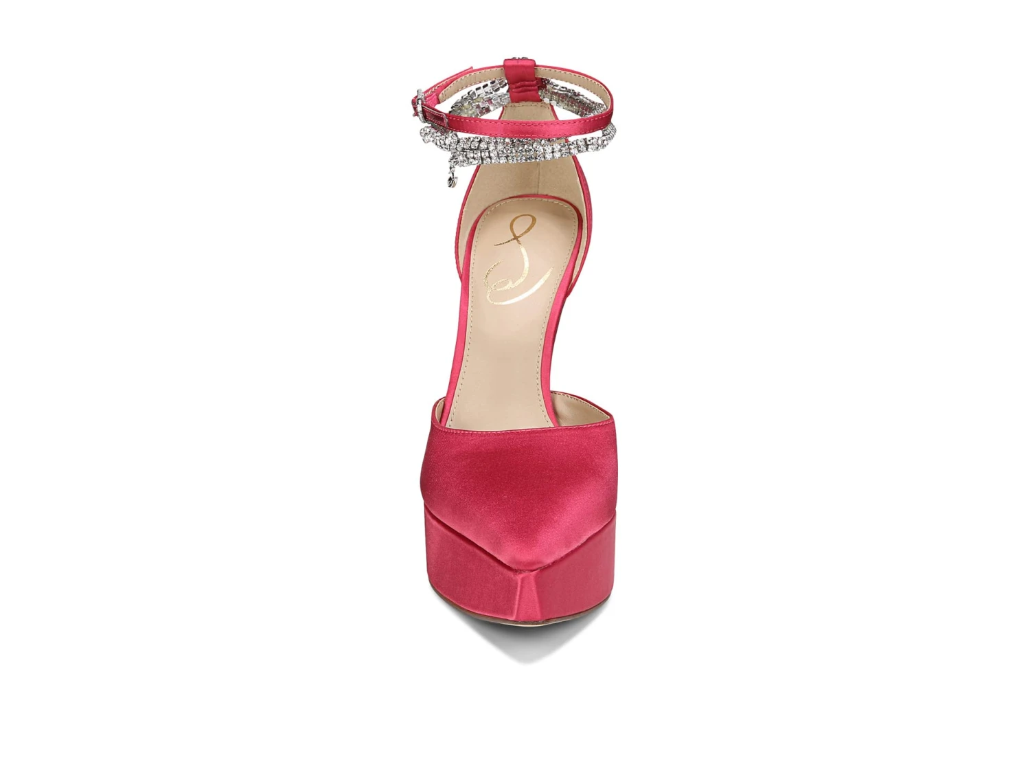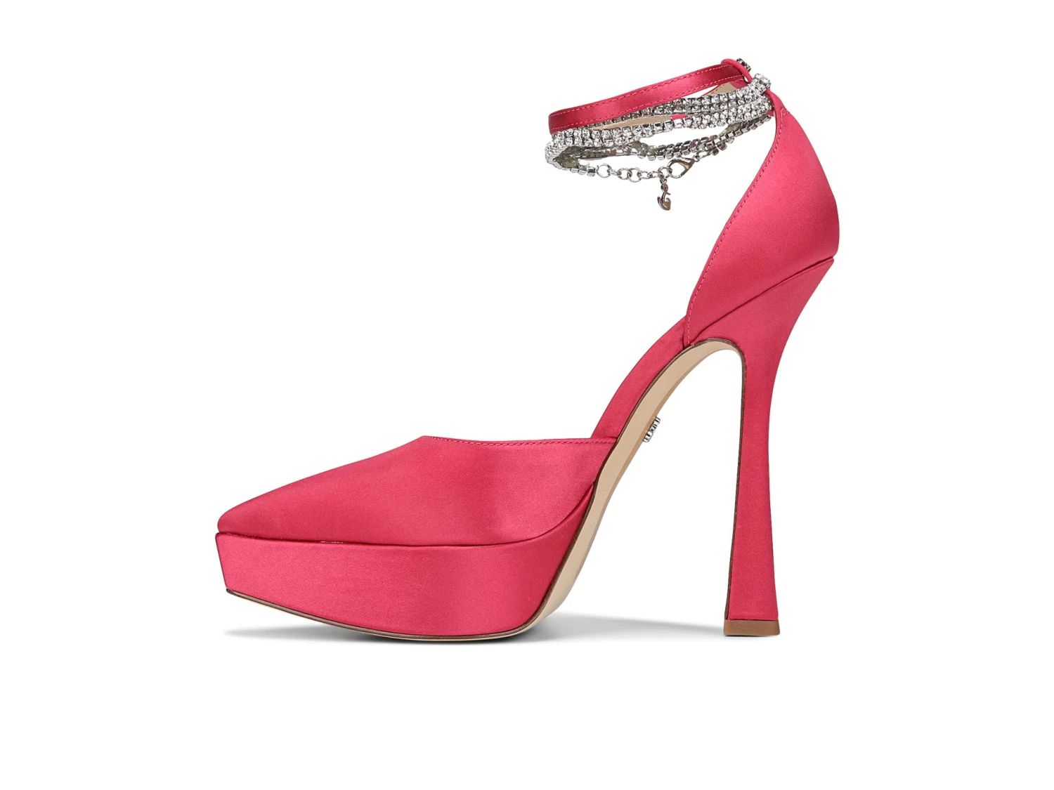 - Ankle straps with buckle closure on one and rhinestone-embellished details on the other.
